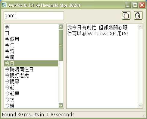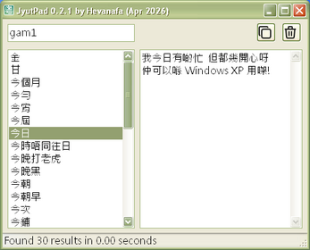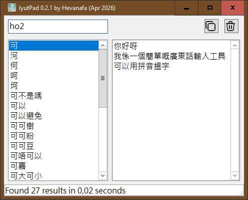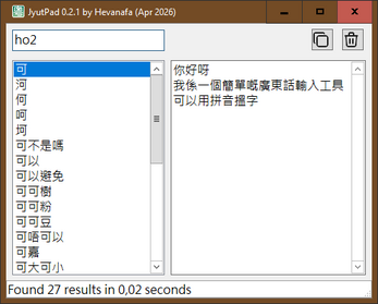 Type using Jyutping, select results either with the Enter key or double click, and the result appears on the output box on the right side